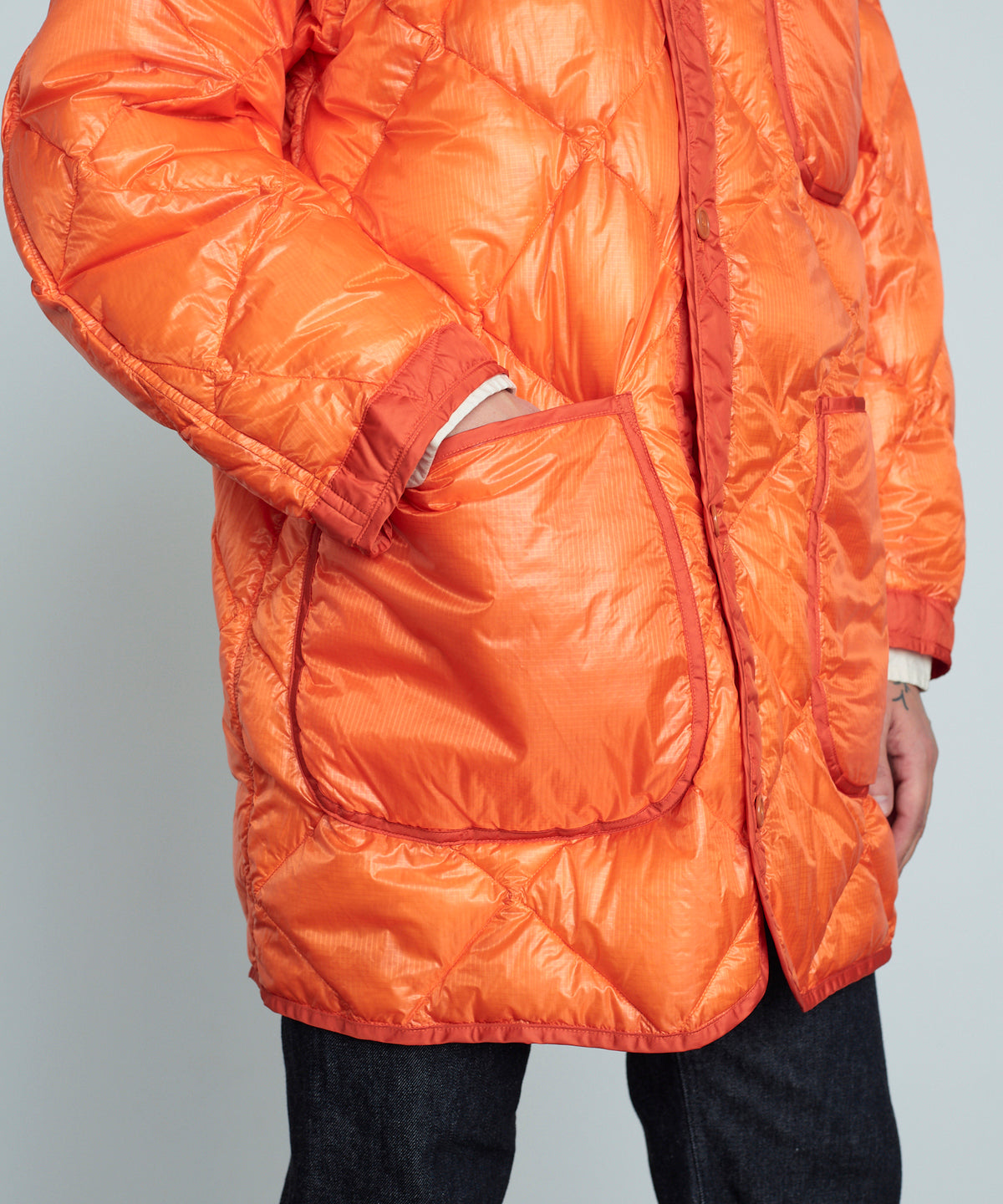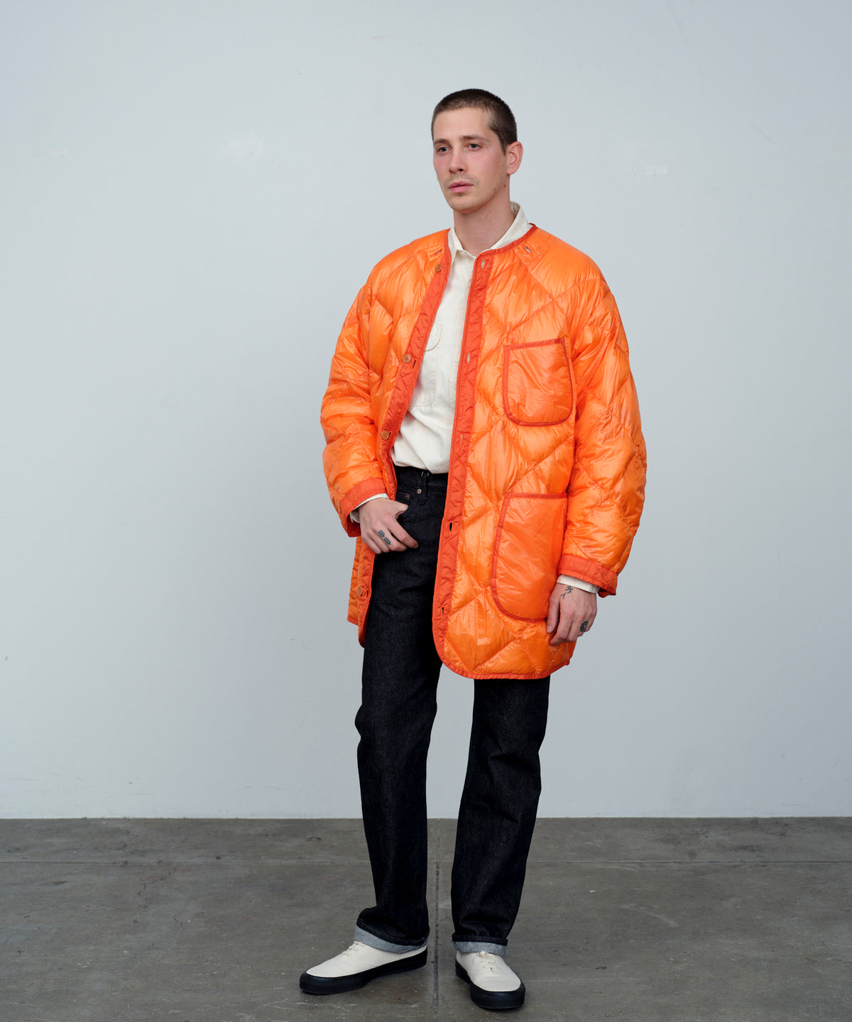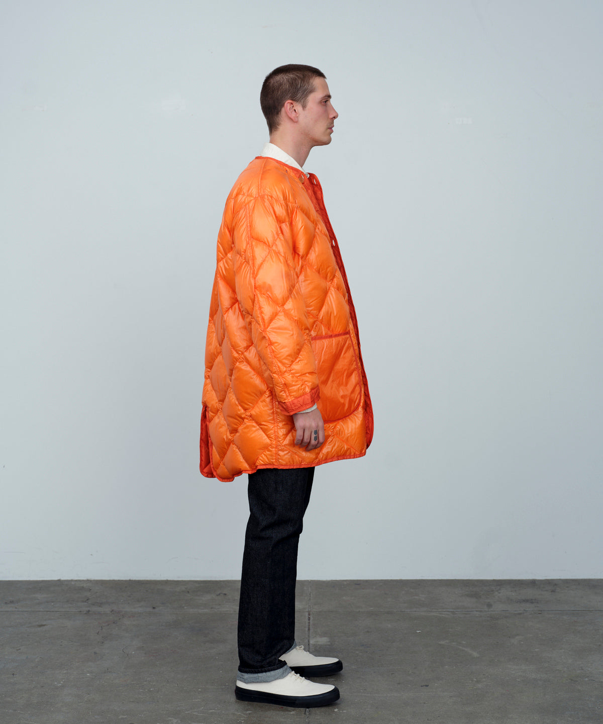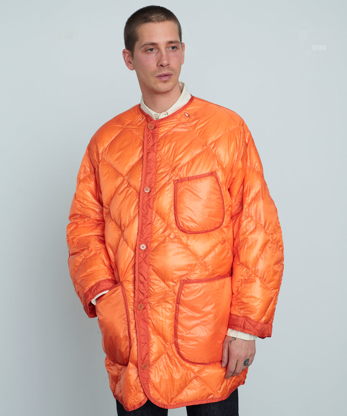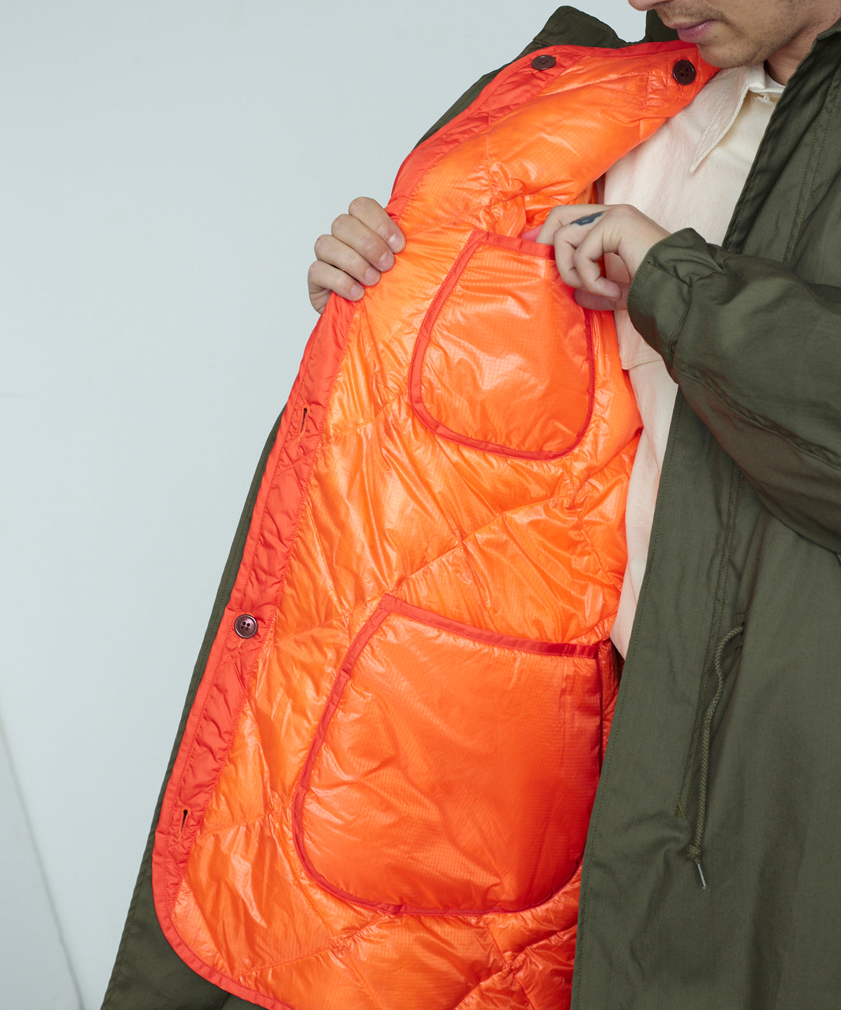 今回はフード無しで、裏地には脱着可能なライナーダウンが装着されています。季節にあわせて取り外しして頂く事で、1年中活躍できるアイテムとなっております。