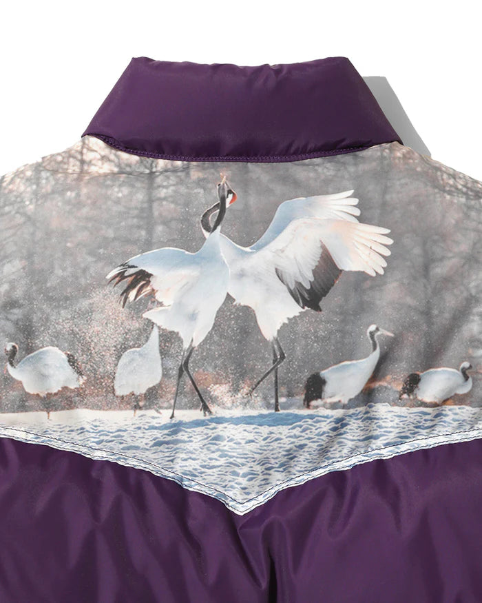 Rocky Mountain Featherbedを象徴するヨークダウンをベースに、通常は一枚革で仕立てられるレザーヨークを排し、夕景や雪原を舞う丹頂鶴のフォトプリントを大胆にあしらいました。