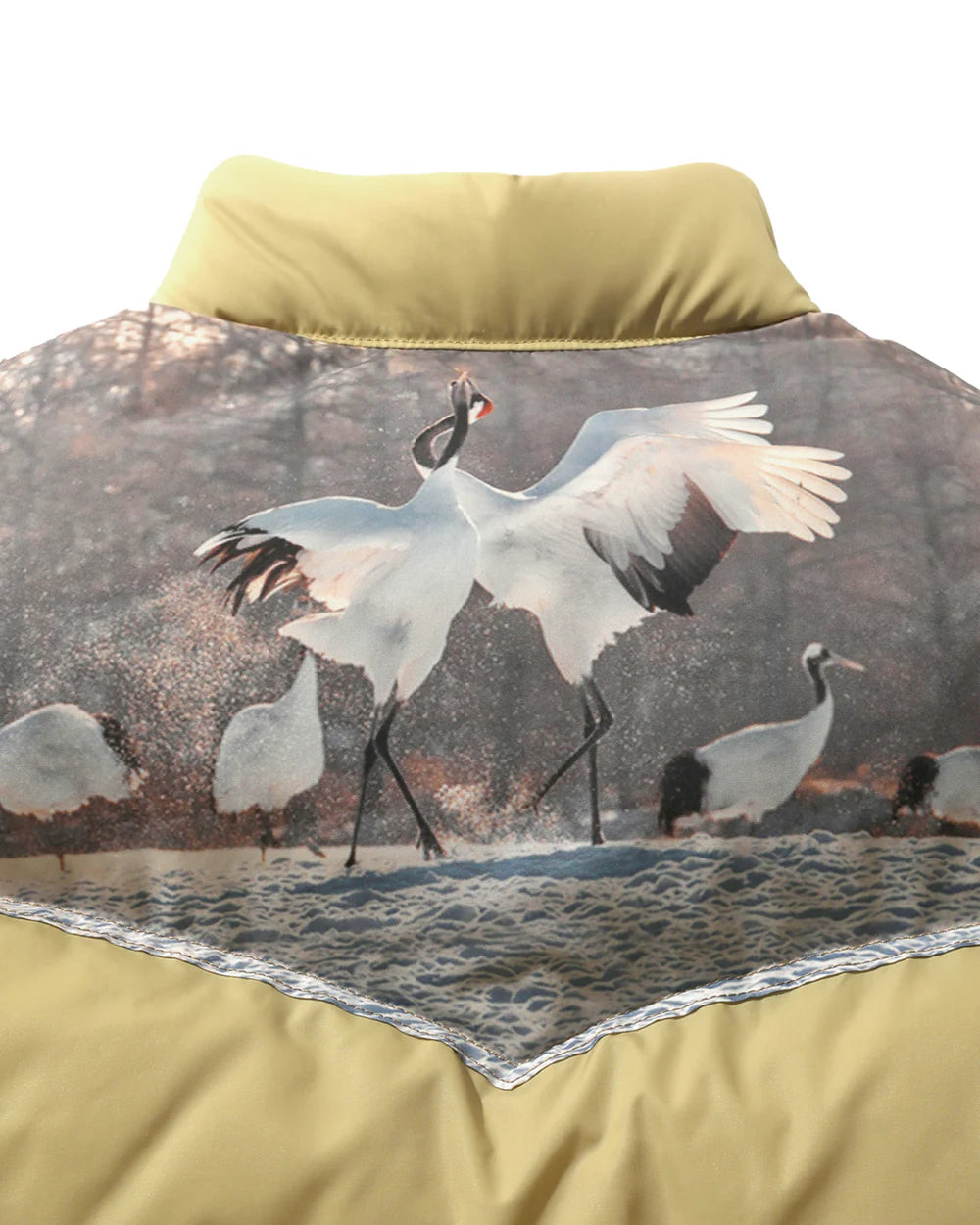 Rocky Mountain Featherbedを象徴するヨークダウンをベースに、通常は一枚革で仕立てられるレザーヨークを排し、夕景や雪原を舞う丹頂鶴のフォトプリントを大胆にあしらいました。