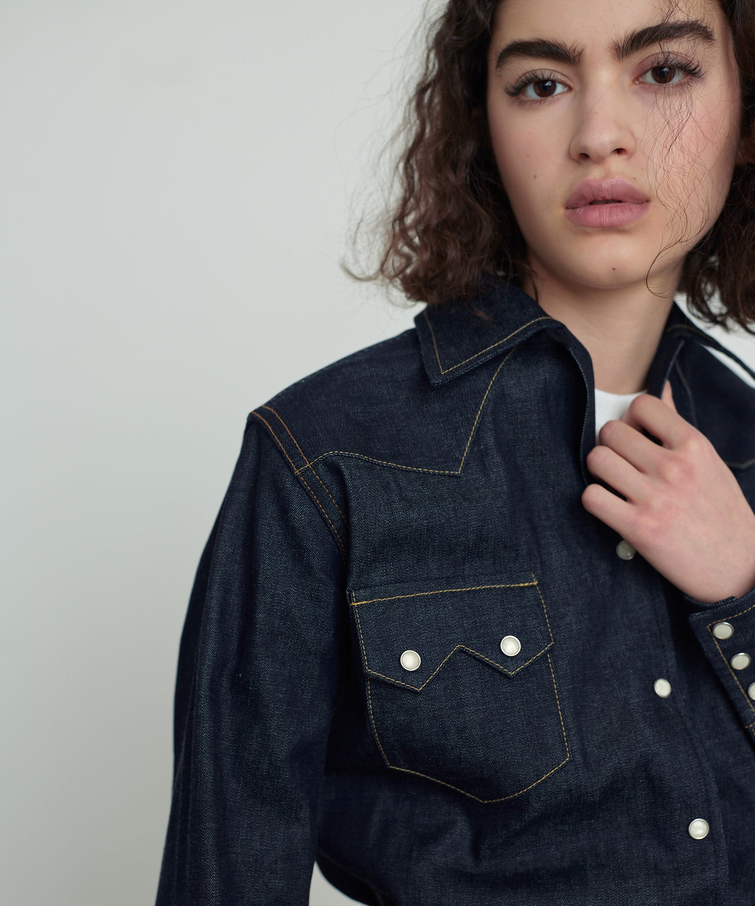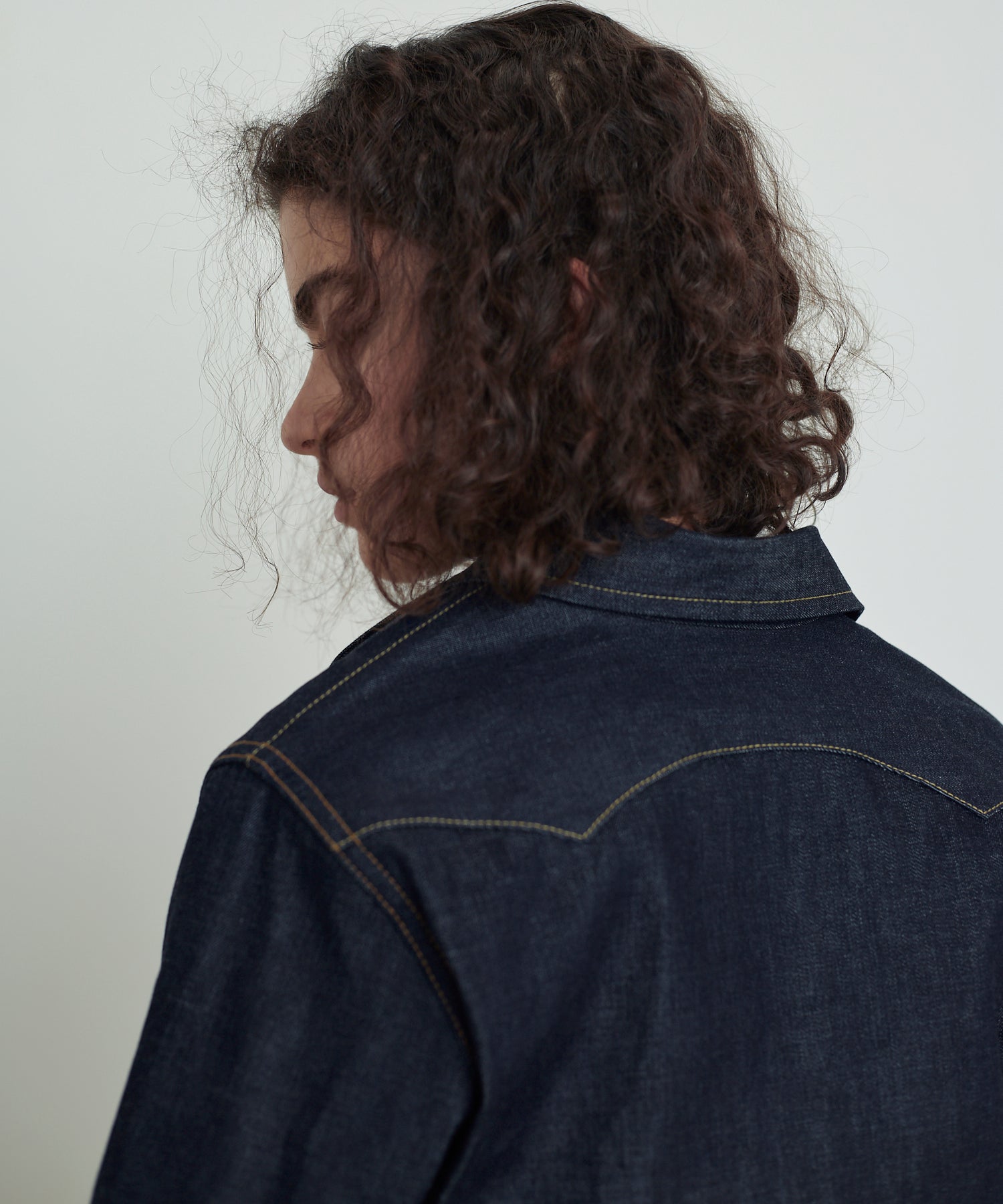 ・生地は8ozデニムを使用。程よい厚みと、洗いをかけた柔らかい生地。オープンカラーも特徴。