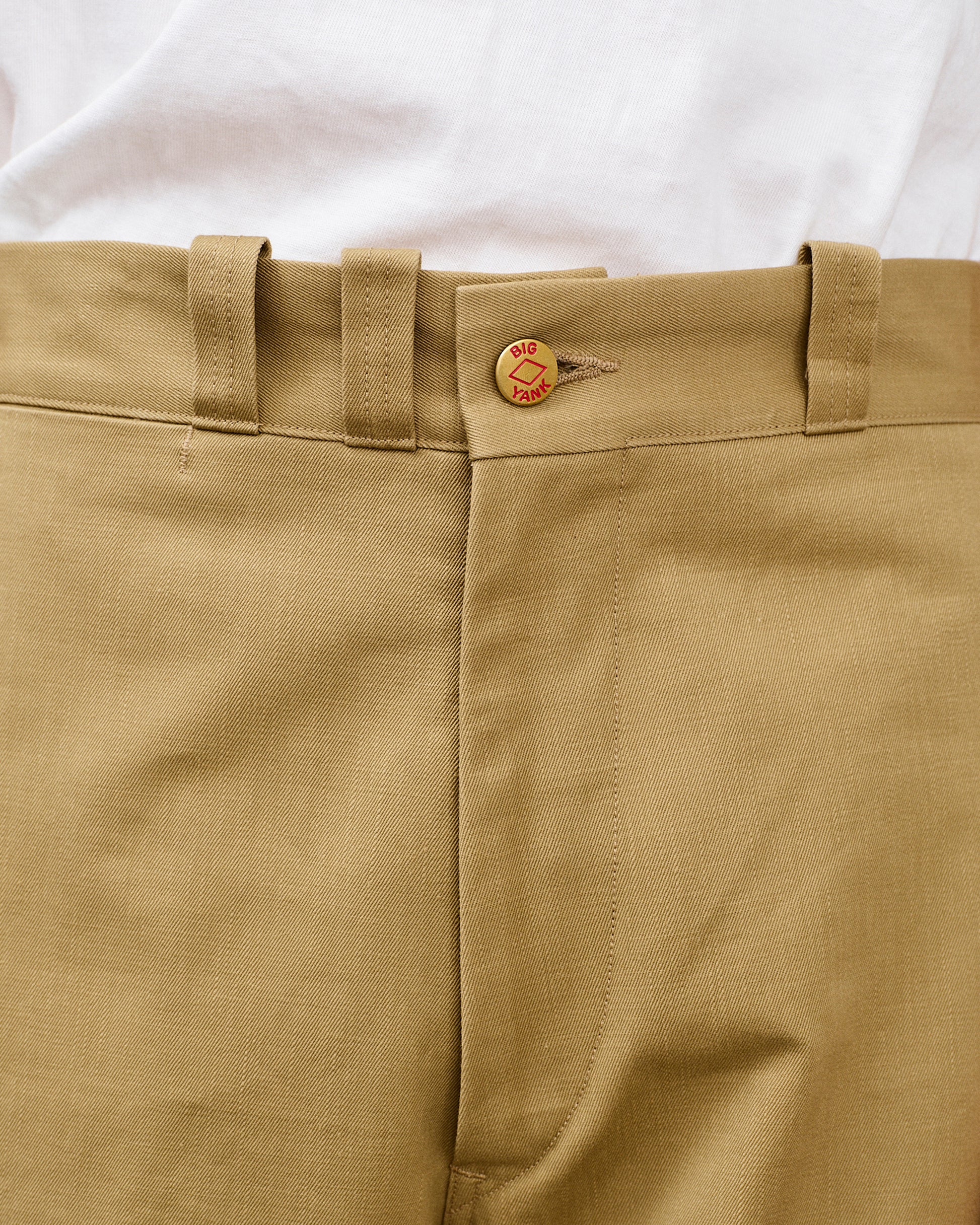 特徴的なフロントの2本のベルトループ、股下のクロッチのような仕様、内側ではなく外側に付いたラベルもヴィンテージに特有なディティール。フロントのトップボタンにはBIG YANKのロゴ入りメタル釦を採用、藤原 裕氏のこだわりが詰まったチノパンツ。