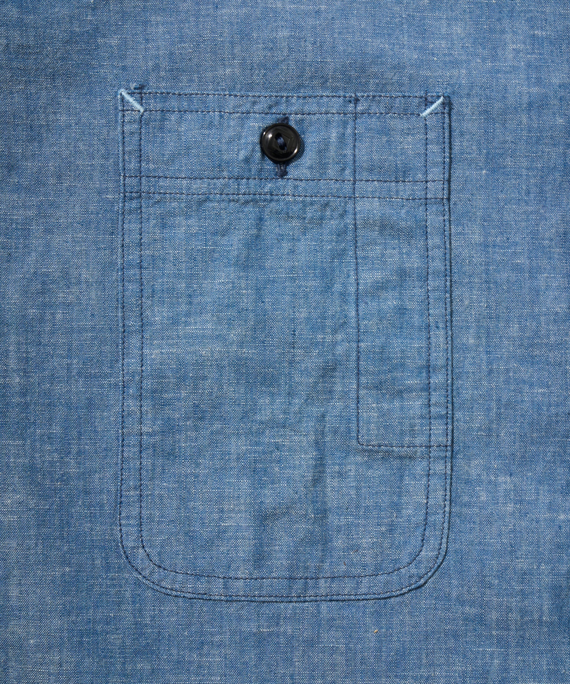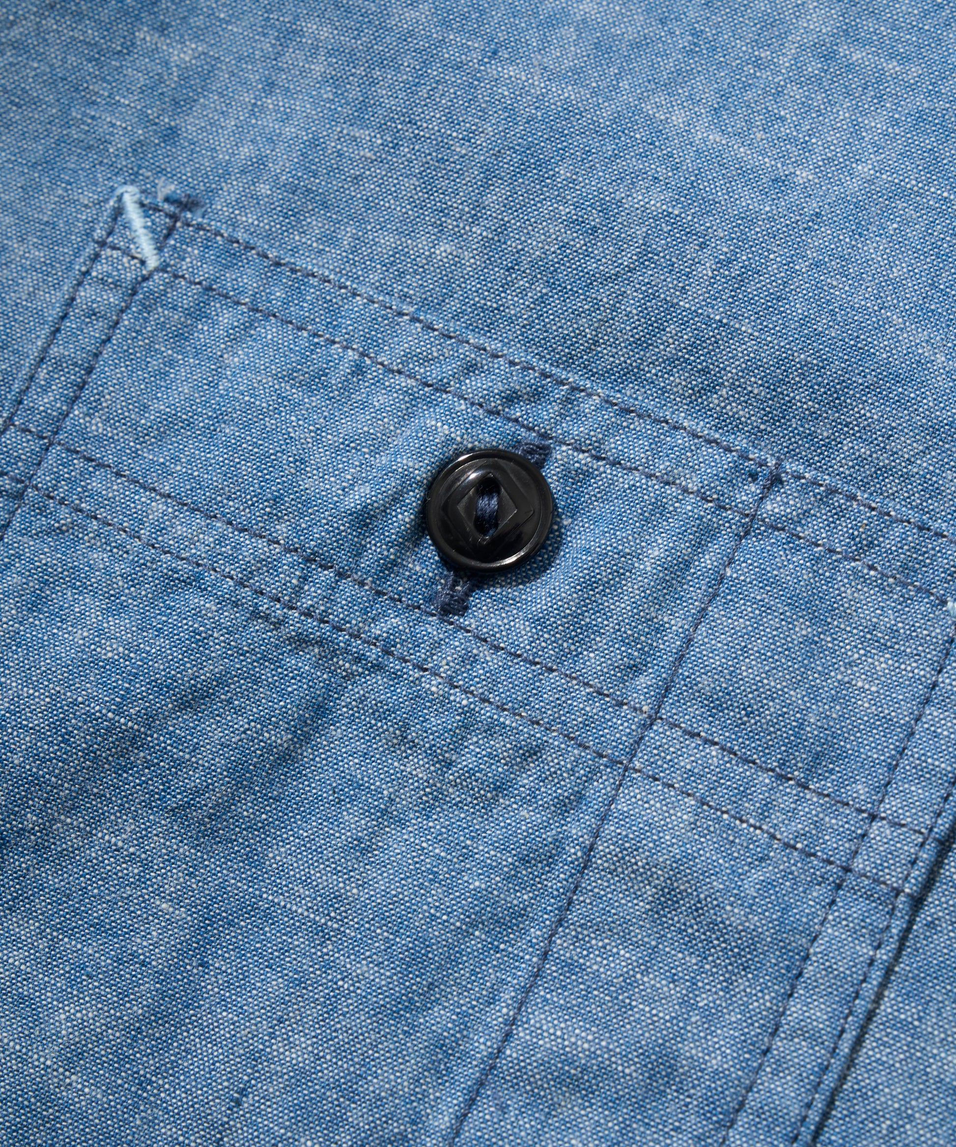 素材は、ヴィンテージのセルビッチシャンブレーを再現。当時と同様にロープ染めのインディゴ糸で織ったこの生地は着込むほどに風合いが増し、柔らかく丈夫で、着込むほどに風合いが増し着用と洗いを重ねることで深みのある色合い変化する一着。