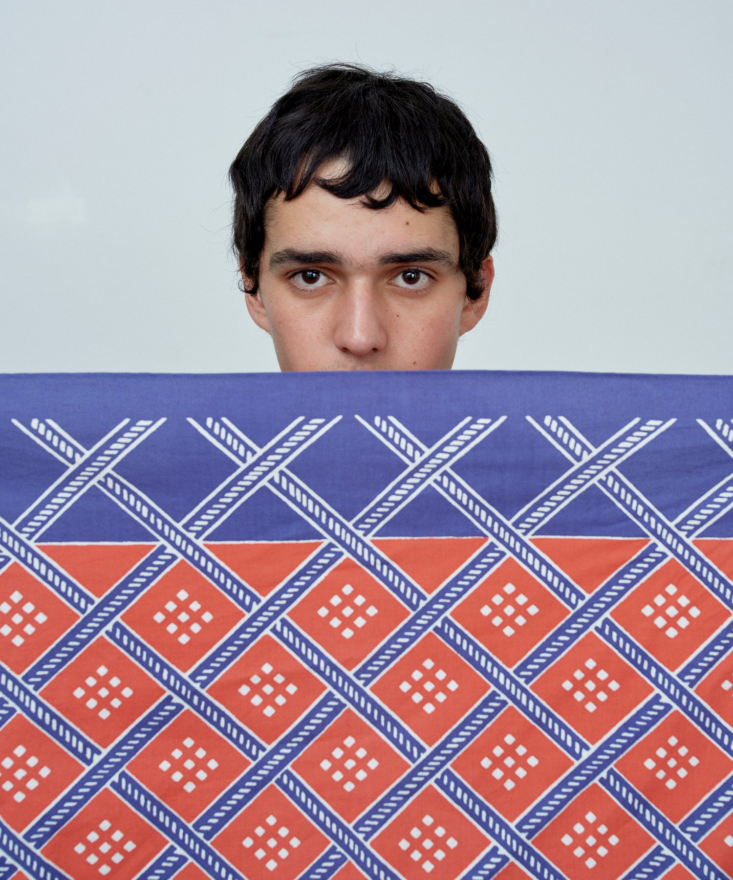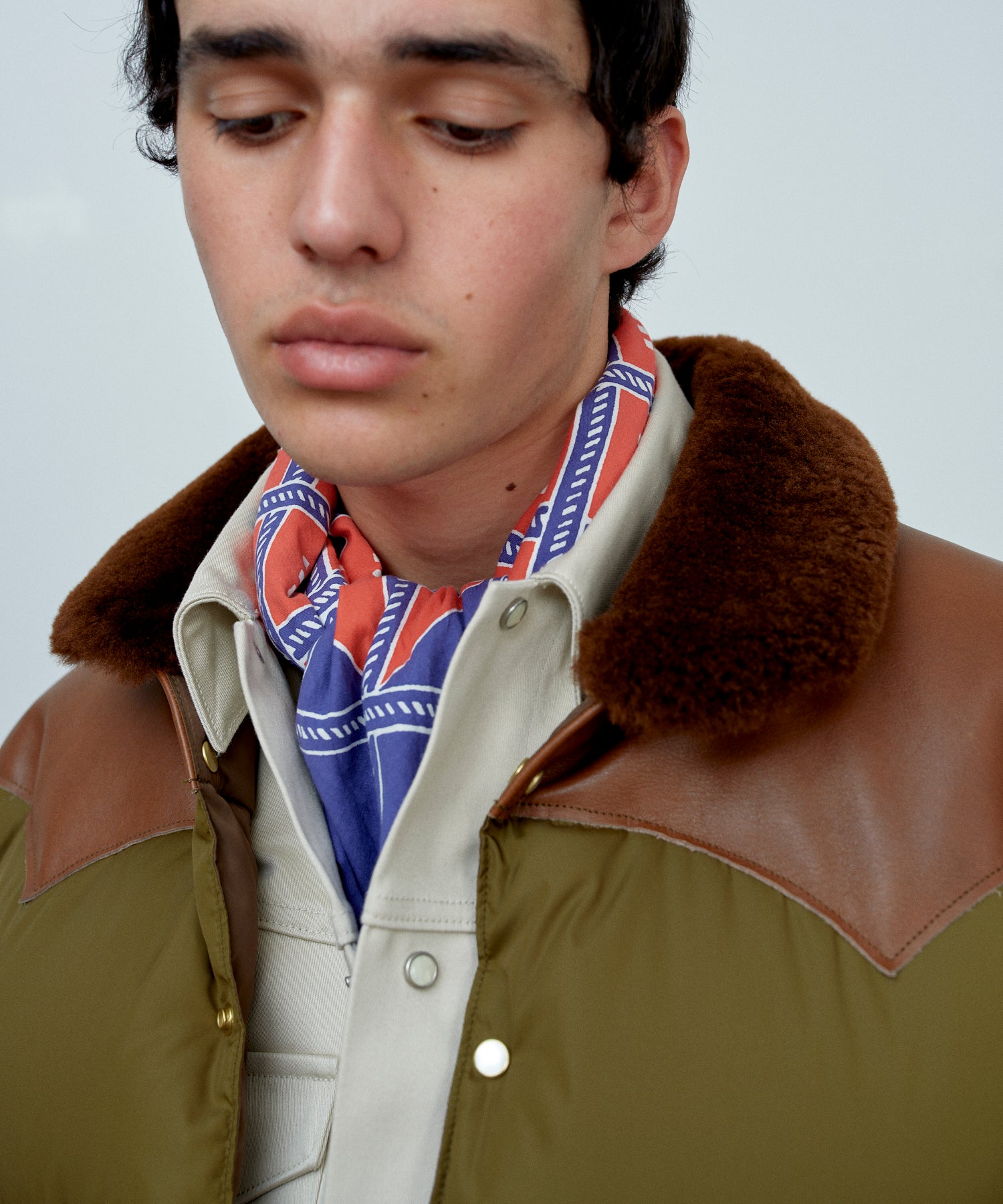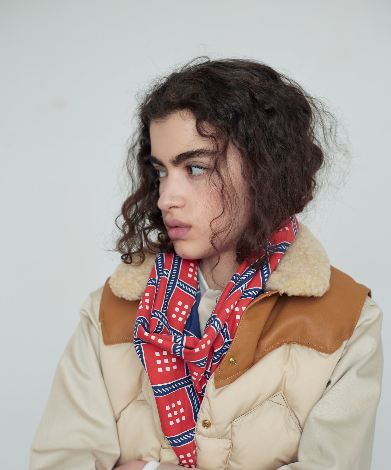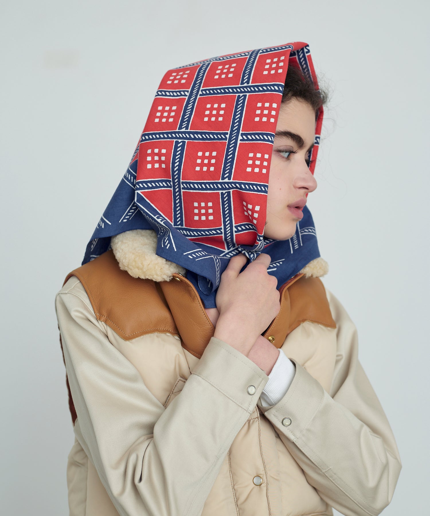 為了使用織物的耳朵(細胞VIGE)的兩端,它是一種棉緞材料的圍巾,其用特殊的Anatomica寬度製成。葡萄酒班丹納是一個設計來源。通過製作一個沒有在織物上負擔的精加工方法,它實現了唯一的柔軟和凸出的紋理。