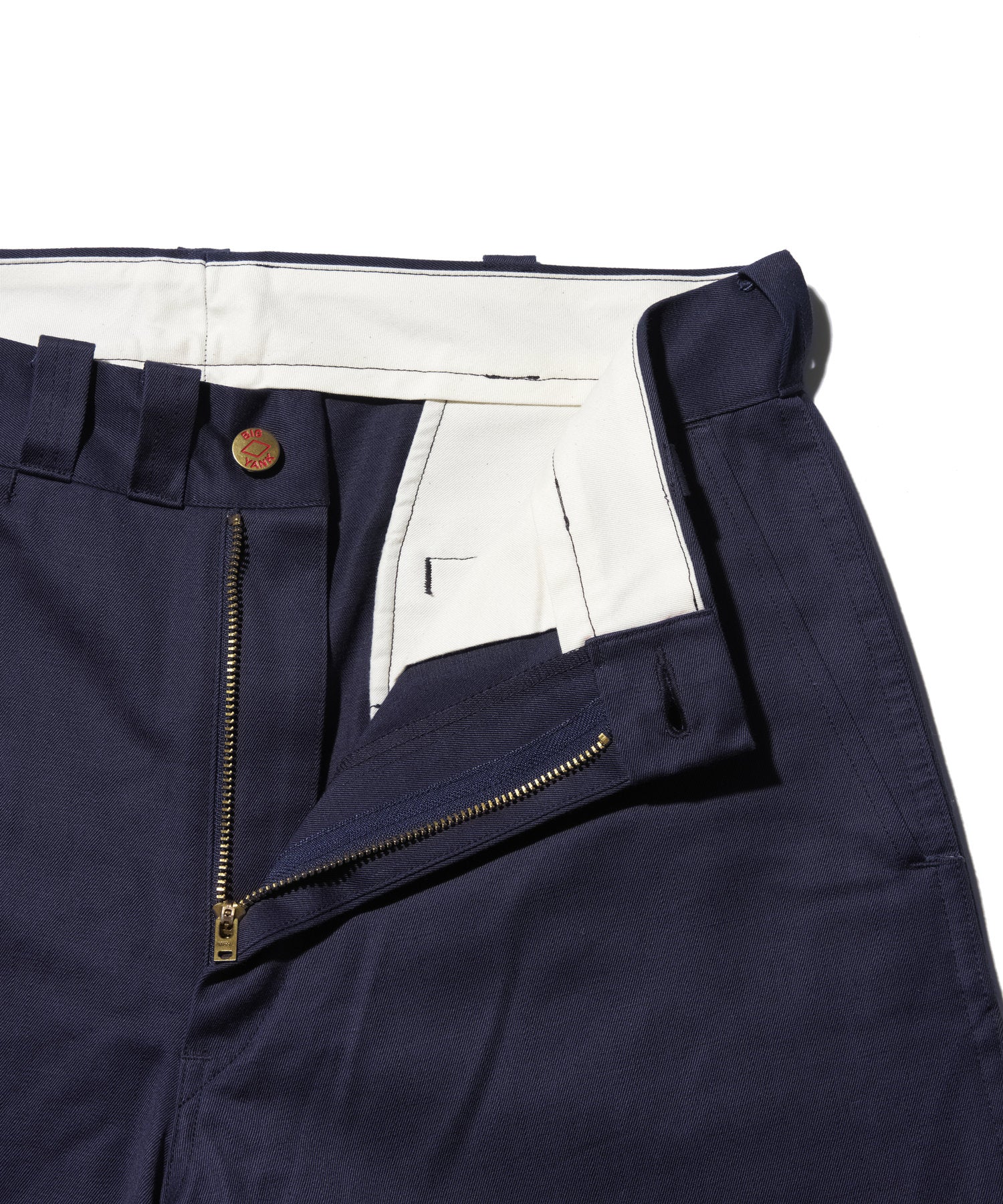 特徴的なフロントの2本のベルトループ、股下のクロッチのような仕様、内側ではなく外側に付いたラベルもヴィンテージに特有なディティール。フロントのトップボタンにはBIG YANKのロゴ入りメタル釦を採用、藤原 裕氏のこだわりが詰まったチノパンツ。